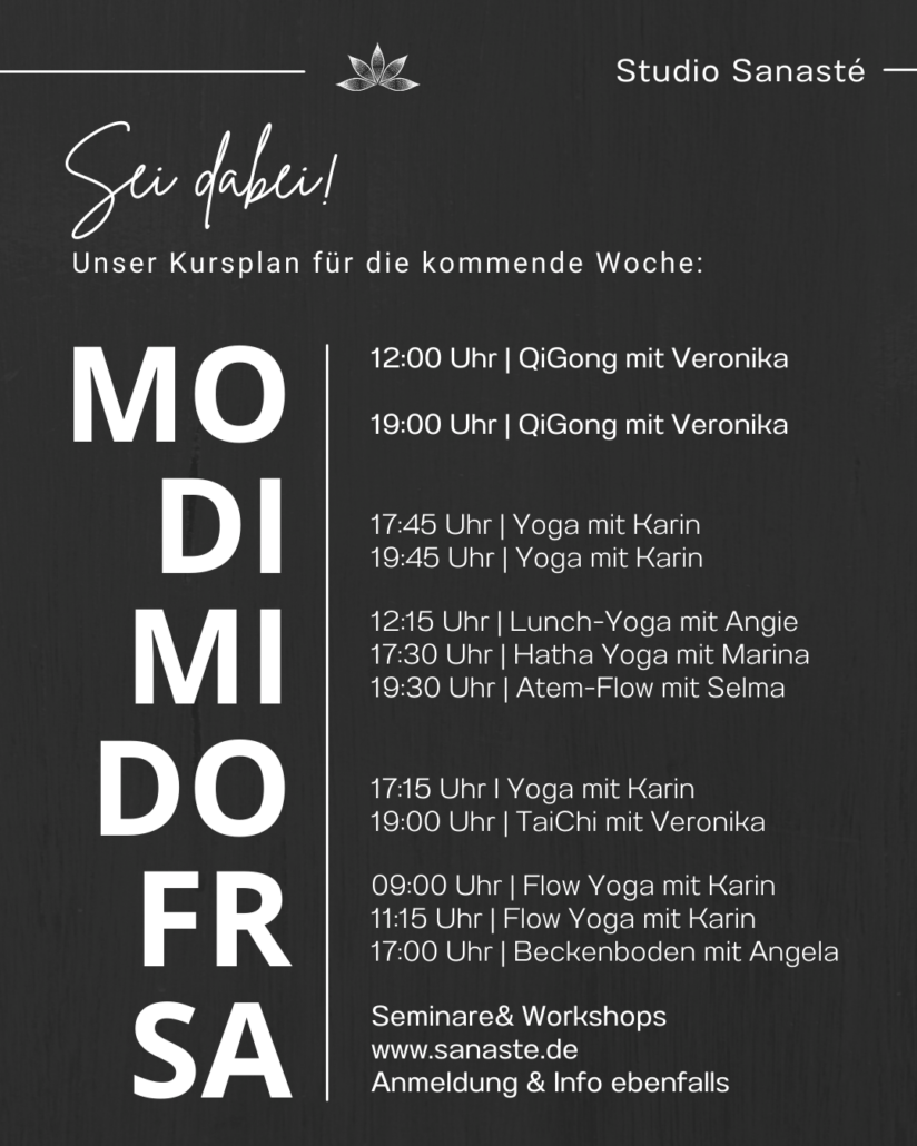Kurse wie Yoga, QiGong, TaiChi, Atemarbeit und Beckenbodentraining unterstützen Mobilität, innere Ruhe und die Verbindung zum eigenen Körper. Sie stärken das Körperbewusstsein, fördern eine gesunde Haltung und helfen dabei, Spannungen abzubauen sowie neue Kraft zu schöpfen. Dabei stehen nicht Leistung oder Perfektion im Vordergrund, sondern ein achtsamer und individueller Zugang zur Bewegung.